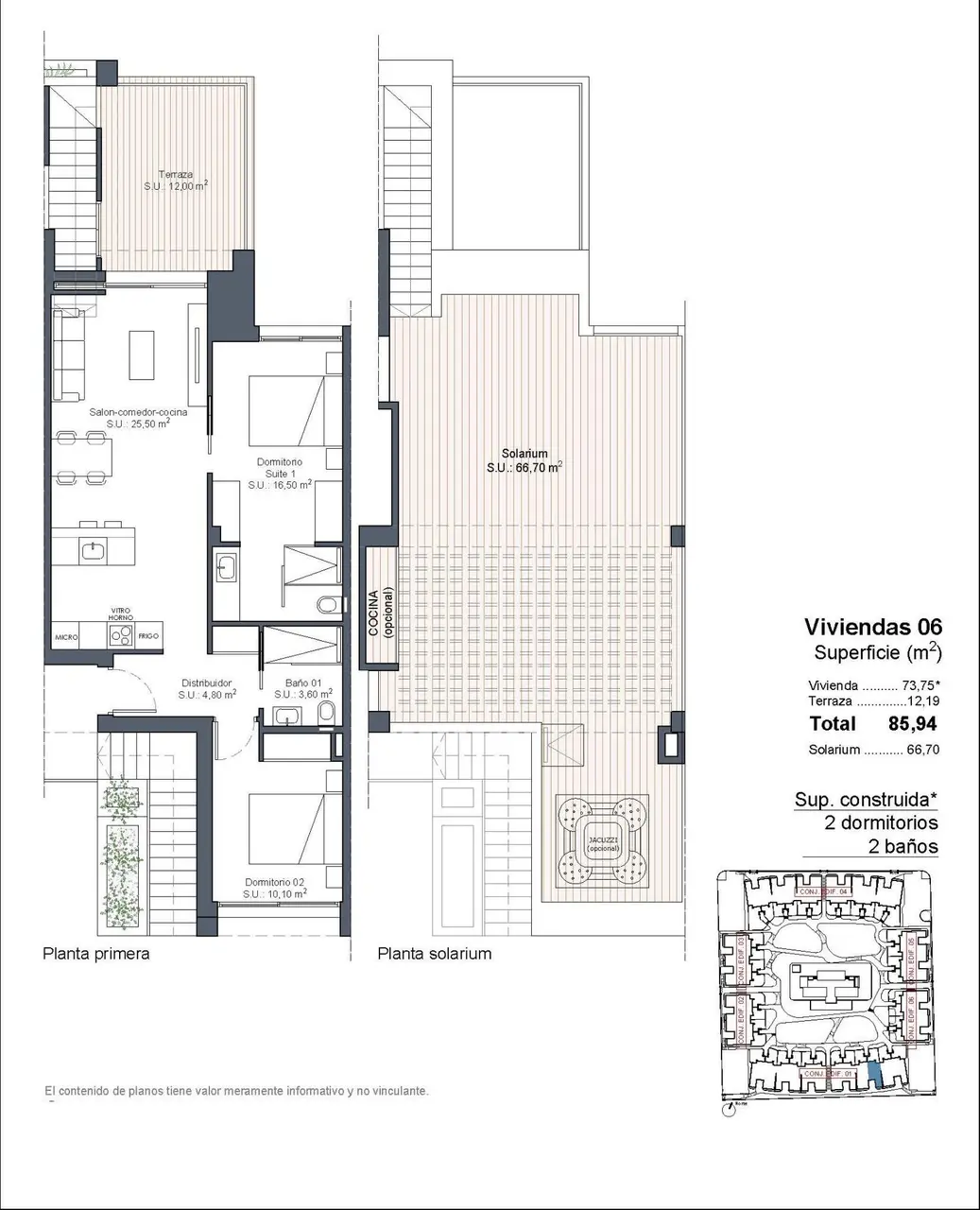 Ekskluzywne nowe nieruchomości w Lo Marabú, Ciudad Quesada Nowoczesny design i maksymalny komfort w śródziemnomorskim otoczeniu Odkryj ten spektakularny kompleks mieszkaniowy w Lo Marabú, Ciudad Quesada, składający się z 80 domów z 2 i 3 sypialniami i 2 łazienkami. Zaprojektowane z nowoczesnym i wydajnym podejściem, nieruchomości te oferują przestronne tarasy, wentylację krzyżową i wysokiej jakości wykończenia, aby zmaksymalizować komfort i efektywność energetyczną. Nieruchomości na parterze mają prywatne ogrody, podczas gdy nieruchomości na najwyższym piętrze mają prywatne solaria z wstępną instalacją jacuzzi i prysznicem na świeżym powietrzu. Ponadto osiedle posiada wspólne baseny otoczone ogrodami, tworząc idealne środowisko do relaksu i spotkań towarzyskich. Wysokiej jakości funkcje dla ekskluzywnego stylu życia Każdy dom został zaprojektowany tak, aby zapewnić maksymalny komfort, przy użyciu najwyższej jakości materiałów i nowoczesnego wzornictwa: Duże przesuwne okna aluminiowe z przegrodą termiczną. Zmotoryzowane rolety dla większego komfortu. Szyby Climalit 4+4/14/4/4+4 zapewniające izolację termiczną i akustyczną. Pancerne drzwi wejściowe z zamkiem bezpieczeństwa. W pełni wyposażona kuchnia z urządzeniami elektrycznymi. Łazienki z meblami, lustrami i parawanami prysznicowymi. System aerotermalny 150L do ciepłej wody. Kompletna instalacja klimatyzacji kanałowej (ciepło/zimno). Oświetlenie we wszystkich pokojach już zainstalowane. Miejsce parkingowe wliczone w cenę. Dzięki podwójnej fasadzie domy oferują naturalną wentylację krzyżową, zapewniając chłód latem i zmniejszając zużycie energii w klimatyzacji. Uprzywilejowana lokalizacja w Ciudad Quesada Lo Marabú to ekskluzywna dzielnica mieszkaniowa w Ciudad Quesada (Rojales), otoczona naturalnymi przestrzeniami i ze wszystkimi usługami w zasięgu ręki. Urbanizacja znajduje się bardzo blisko słonych jezior La Mata i Torrevieja, idealnego środowiska do cieszenia się przyrodą i poprawy samopoczucia. Z nowego domu będziesz miał szybki dostęp do głównych atrakcji w okolicy: Plaże Guardamar del Segura i Torrevieja – 10 km (15 minut jazdy samochodem). Lotnisko Alicante-Elche (ALC) – 38 km (35 minut jazdy samochodem). Lotnisko Murcja-Corvera (RMU) – 65 km (50 minut jazdy samochodem). Prestiżowe pola golfowe – mniej niż 5 km. Centra handlowe i restauracje – zaledwie kilka minut. Szybki dostęp do autostrad AP-7 i N-332, łączących się z całym wybrzeżem Costa Blanca. Idealny dom, aby cieszyć się Morzem Śródziemnym Dzięki połączeniu nowoczesnego designu, strategicznej lokalizacji i wyjątkowego naturalnego otoczenia, te domy w Lo Marabu są idealne na pobyt stały, dom wakacyjny lub nieruchomość inwestycyjną. Nie przegap tej wyjątkowej okazji. Skontaktuj się z nami już dziś, aby uzyskać więcej informacji lub umówić się na oglądanie swojego przyszłego domu w Ciudad Quesada.