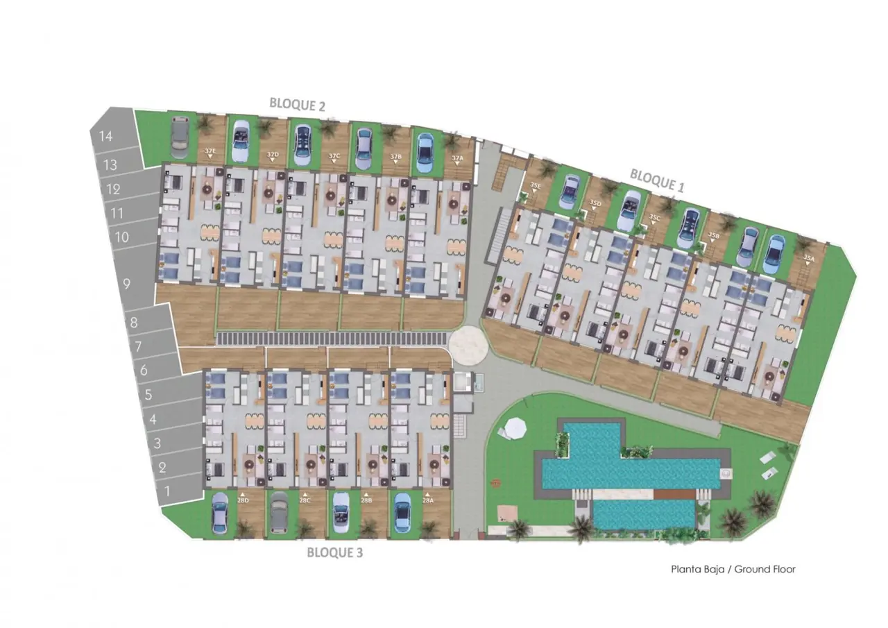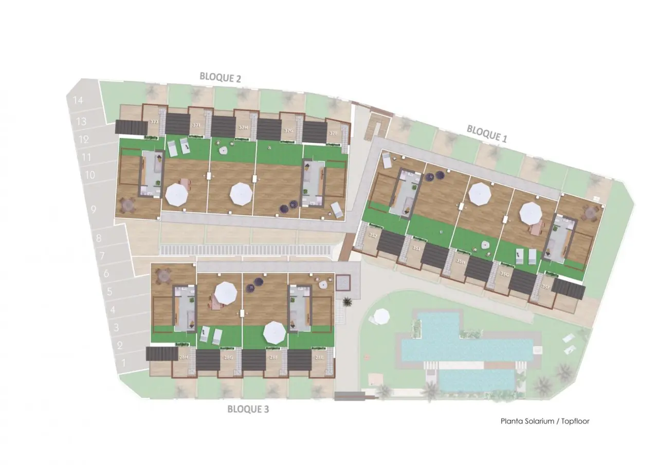 NOWY BUDYNEK MIESZKALNY Z APARTAMENTAMI W BUNGALOWACH W PILAR DE LA HORADADA Nowy budynek mieszkalny z 28 bungalowów z 2 sypialniami, 2 łazienki na parterze z prywatnym ogrodem i 2 i 3 sypialnie i 2 i 3 łazienki na najwyższym piętrze z prywatnym solarium. Rezydencja z basenem komunalnym. Każda nieruchomość posiada miejsce parkingowe. Relaksujące połączenie naturalnych materiałów i bogatej dekoracji. Z praktycznością posiadania wszystkich usług, tylko 300 metrów od centrum miasta Pilar de la Horadada i mniej niż 3 km od plaży, w samym sercu Costa Blanca. Pilar de la Horadada to typowa hiszpańska wioska położona w najbardziej południowej części Costa Blanca. Przy dużej głównej ulicy znajdują się supermarkety, wiele sklepów, restauracji i barów oraz kilka pięknych placów. Do pięknych plaż Torre de la Horadada i Mil Palmeras z drobnym piaskiem i promenadą jest zaledwie 5 minut drogi. Lotniska Corvera (Murcja) i Alicante są oddalone odpowiednio o 40 i 55 minut jazdy.