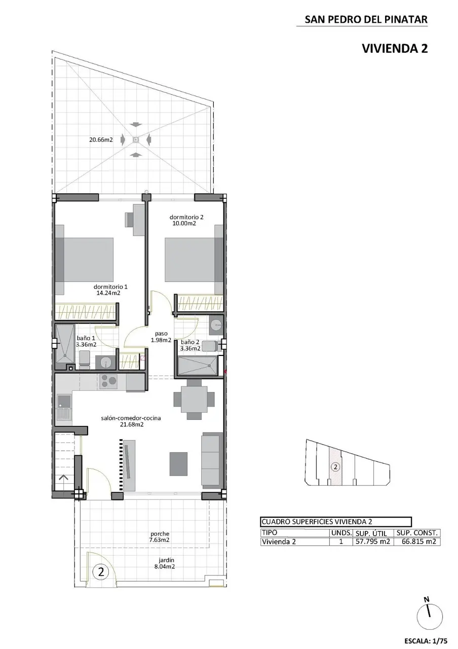 Nowe bungalowy w San Pedro del Pinatar – doskonała lokalizacja zaledwie 500 m od plaży Ekskluzywne domy w stylu butikowym w pobliżu wybrzeża Odkryj te eleganckie nowe bungalowy w sercu San Pedro del Pinatar, zaledwie 500 metrów od wspaniałych plaż Mar Menor. Ta butikowa inwestycja obejmuje tylko osiem charakterystycznych domów, łączących nowoczesny design, komfort i spokojny nadmorski styl życia. Dostępne modele dopasowane do Twojego stylu życia Model Garden/Ground Floor: Posiada przedni taras i przestronne tylne patio, idealne do życia na świeżym powietrzu. Model Penthouse Loft: Obejmuje prywatne solarium na dachu i przedni taras, oferując otwarte widoki i mnóstwo światła słonecznego. Szczegóły modelu Garden/Ground Floor Wejdź do jasnej przestrzeni dziennej, która płynnie łączy się z jadalnią i w pełni wyposażoną kuchnią. Duże przesuwane szklane drzwi wpuszczają naturalne światło, tworząc otwartą i zachęcającą atmosferę. Układ obejmuje dwie przestronne sypialnie, w tym główną sypialnię z łazienką, a także nowoczesną łazienkę rodzinną. Najważniejsze cechy modelu Penthouse Do penthouse’u prowadzą prywatne schody prowadzące na duży taras. Wewnątrz znajduje się salon i jadalnia na otwartym planie oraz w pełni wyposażona kuchnia. Dwie sypialnie są wliczone w cenę, a główna sypialnia oferuje łazienkę. Prywatne solarium na dachu, dostępne z kuchni, stanowi idealne miejsce do relaksu lub rozrywki. Dodatkowe schowki na parterze zapewniają wygodę. Kluczowe cechy i udogodnienia Wewnętrzne i zewnętrzne oświetlenie LED. W pełni wyposażona kuchnia z płytą indukcyjną, piekarnikiem, zmywarką i lodówko-zamrażarką. Zainstalowana klimatyzacja. Wyznaczone miejsce parkingowe. Wspólny ogród z basenem dla mieszkańców. San Pedro del Pinatar: nadmorski urok i wygoda Położone na pięknym wybrzeżu Mar Menor i Morza Śródziemnego, San Pedro del Pinatar jest rajem dla miłośników sportów wodnych, żeglarstwa i plażowania. Pobliski obszar Lo Pagán oferuje naturalne kąpiele błotne, spokojne wody i całoroczne udogodnienia, w tym sklepy, restauracje i obiekty rekreacyjne. Odległości do najważniejszych atrakcji: Centrum handlowe Dos Mares: 5 km Lotnisko Murcja/Korwera: 30 km Lotnisko Alicante: 75 km Lokalne pola golfowe: 10-20 km Przystań i kluby żeglarskie: 2 km Zarezerwuj swój wymarzony dom już dziś Zakończenie budowy zaplanowano na koniec 2025 r., więc teraz jest idealny czas, aby zabezpieczyć swój nowy dom w San Pedro del Pinatar. Nie przegap okazji, aby cieszyć się połączeniem nowoczesnej elegancji i nadmorskiego spokoju. Skontaktuj się z nami już dziś, aby dowiedzieć się więcej lub umówić się na wizytę!