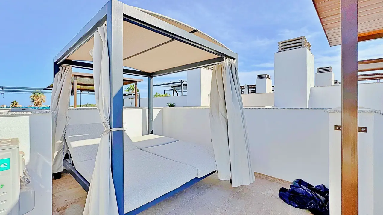 Nieruchomość posiada również duży, prywatny taras z widokiem na lagunę Torrevieja, wyposażony w strefę chill-out, pergolę, grill i leżaki – idealne miejsce na spotkania na świeżym powietrzu lub po prostu relaks w spokojnej okolicy.