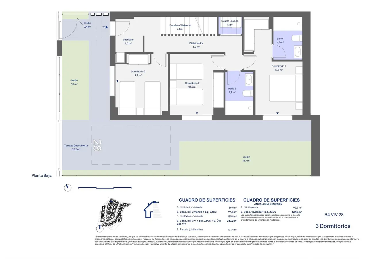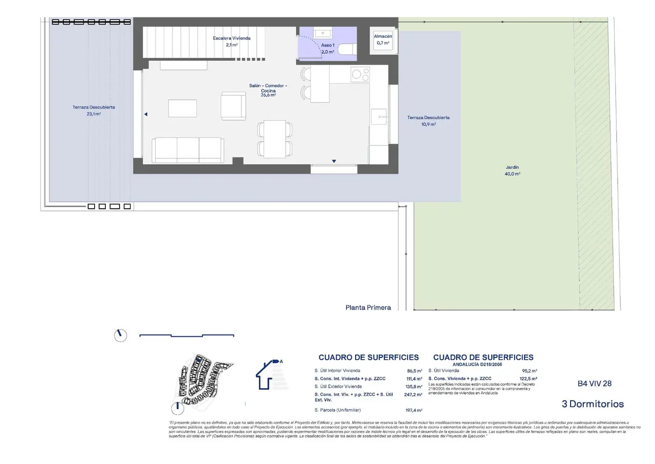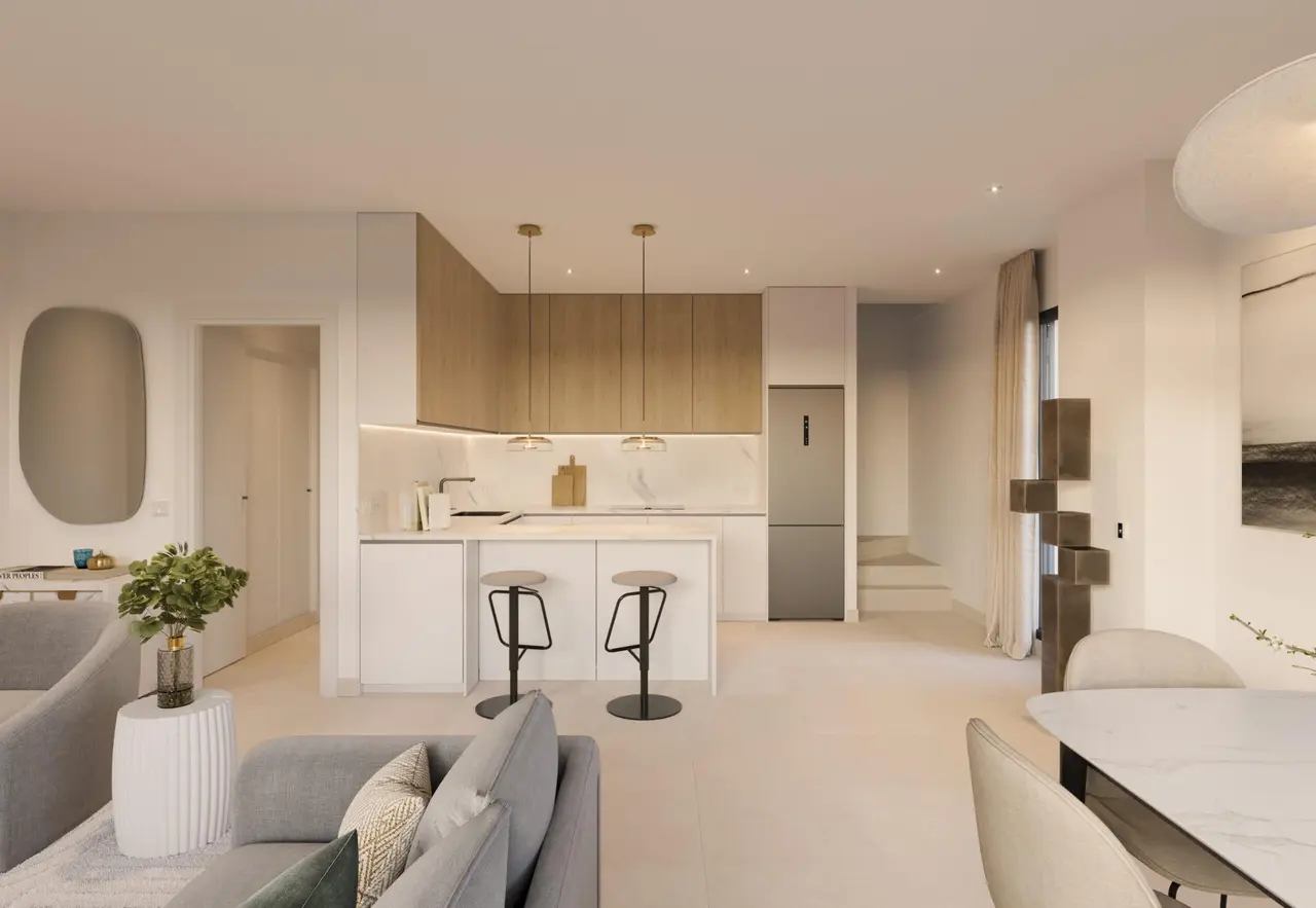 Nowe domy z widokiem na morze w Castillo de Lagos, wschodnie wybrzeże Costa del Sol Spokojna i uprzywilejowana lokalizacja zaledwie 100 metrów od morza Ta ekskluzywna inwestycja znajduje się na osiedlu Castillo de Lagos, w naturalnym otoczeniu z przepięknym widokiem na Morze Śródziemne. Położona w spokojnej i podwyższonej dzielnicy mieszkalnej, inwestycja cieszy się łatwym dostępem do pobliskich plaż, oddalonych o zaledwie 100 metrów, oraz do takich miejscowości jak El Morche, Torrox i Torre del Mar. Jest to wyjątkowa okazja, aby cieszyć się śródziemnomorskim stylem życia w spokojnej okolicy z doskonałym połączeniem komunikacyjnym. Domy bliźniacze o zrównoważonym projekcie i doskonałej jakości Projekt składa się z 45 domów jednorodzinnych w zabudowie bliźniaczej, zaprojektowanych w harmonii z topografią terenu i z myślą o zrównoważonym rozwoju. Wszystkie domy mają 3 sypialnie, 2 łazienki i 1 toaletę, rozmieszczone na dwóch kondygnacjach. Położenie od strony południowo-wschodniej, południowej i południowo-zachodniej zapewnia doskonałe doświetlenie naturalne i panoramiczne widoki na morze z tarasów i prywatnych ogrodów. Funkcjonalne i nowoczesne wnętrza Każdy dom jest oddawany do użytku z umeblowaną kuchnią i wyposażoną w sprzęt AGD, idealny do zamieszkania od pierwszego dnia. Zewnętrzna stolarka obejmuje profile aluminiowe z przegrodą termiczną i podwójnymi szybami termoakustycznymi, co gwarantuje komfort termiczny i izolację akustyczną. Drzwi wejściowe są wzmocnione i wyposażone w zamek bezpieczeństwa dla większego spokoju. Efektywność energetyczna i komfort przez cały rok System produkcji ciepłej wody za pomocą aerotermii oraz kompletna instalacja klimatyzacji kanałowej zapewniają energooszczędne i komfortowe mieszkanie przez cały rok. Do mieszkań przypisane jest również miejsce parkingowe. Pomieszczenia wspólne dla całej rodziny Osiedle oferuje ogrody i wspólny basen, idealne do relaksu, spędzania czasu z rodziną lub spotkań z przyjaciółmi w zadbanym i bezpiecznym otoczeniu. Łączność i usługi w pobliżu Najbliższa plaża: 0,1 km El Morche: 3 km Torrox: 9 km Torre del Mar: 12 km Lotnisko w Maladze: 55 km Pole golfowe Baviera Golf: 14 km Marina Caleta de Vélez: 13 km Centrum handlowe El Ingenio: 13 km Odkryj swój nowy dom nad morzem Nie przegap okazji, aby zamieszkać w jednej z najbardziej atrakcyjnych lokalizacji na wschodnim wybrzeżu Costa del Sol. Skontaktuj się z nami już dziś, aby uzyskać więcej informacji lub umówić się na wizytę w tym wyjątkowym projekcie w Castillo de Lagos.