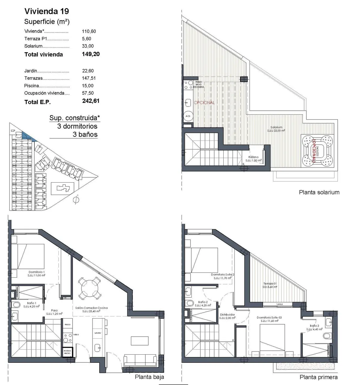Nowe wille z prywatnym basenem w Serena Golf-Los Alcazares Kolekcja nowoczesnych domów w pobliżu morza Odkryj ekskluzywną kolekcję 37 nowoczesnych willi w stylu czteropiętrowym i bliźniaczym, położonych w La Serena Golf w Los Alcazares na pięknym wybrzeżu Costa Calida. Te nowoczesne domy są przeznaczone dla nabywców poszukujących prywatności, słońca i stylu życia na świeżym powietrzu, zaledwie 300 metrów od ciepłych wód Mar Menor. Los Alcazares to urocze nadmorskie miasteczko znane z długiej promenady, piaszczystych plaż i relaksującej śródziemnomorskiej atmosfery. Okolica cieszy się ponad 300 słonecznymi dniami w roku i oferuje doskonałe restauracje, sklepy, przystanie jachtowe i obiekty sportowe. Położenie między morzem a polem golfowym sprawia, że jest to jedno z najbardziej pożądanych miejsc w regionie zarówno do stałego zamieszkania, jak i na wakacje. Nowoczesne wille z prywatnym basenem i przestrzenią zewnętrzną Każda nieruchomość posiada prywatną działkę z własnym basenem, tworząc idealne środowisko do cieszenia się śródziemnomorskim klimatem przez cały rok. Domy posiadają 3 sypialnie i 2 lub 3 łazienki oraz toalety dla gości, oferując komfortowe i funkcjonalne przestrzenie mieszkalne idealne dla rodzin lub gości. Wille zostały zaprojektowane tak, aby podkreślić życie na świeżym powietrzu. Obok basenu znajduje się miejsce na grilla i zewnętrzna toaleta dla gości, idealne do przyjmowania przyjaciół i rodziny. Solarium na dachu oferuje dodatkową przestrzeń do relaksu w słońcu i obejmuje prysznic solarny z przygotowaniem do instalacji jacuzzi i letniej kuchni. Parking jest wliczony w cenę zarówno na prywatnej działce, jak i w postaci przypisanego miejsca parkingowego w garażu podziemnym. Wysokiej jakości wykończenia i nowoczesne wyposażenie Domy są zbudowane z nowoczesnych materiałów i zgodnie z wysokimi standardami jakości, zaprojektowane z myślą o komforcie i stylu. W pełni wyposażona kuchnia z urządzeniami w białym szklanym wykończeniu Łazienki z podświetlanymi lustrami, kabinami prysznicowymi i szafkami pod umywalkę Zmotoryzowane rolety okienne Podstawowy pakiet oświetlenia W pełni zainstalowana klimatyzacja kanałowa Te cechy zapewniają komfortowe warunki życia, niezależnie od tego, czy nieruchomość jest wykorzystywana jako główne miejsce zamieszkania, czy dom wakacyjny. Udogodnienia w stylu kurortu i doskonała lokalizacja Właściciele mają również dostęp do wspólnych udogodnień w stylu kurortu w sąsiedniej inwestycji. Udogodnienia te obejmują ogrody krajobrazowe, wspólny basen w stylu laguny, strefę spa, siłownię i saunę. Lokalizacja zapewnia łatwy dostęp do plaż, pól golfowych i pobliskich miast. Plaża Mar Menor 0,3 km Pole golfowe La Serena obok osiedla Centrum miasta Los Alcazares 2 km Kartagena 22 km Murcja 40 km Międzynarodowe lotnisko Region de Murcia 30 km Lotnisko Alicante Elche 90 km Płytkie wody Mar Menor są idealne do pływania, żeglowania, paddle surfingu i innych sportów wodnych przez cały rok. Zabezpiecz swój śródziemnomorski styl życia w Los Alcazares Te nowo wybudowane wille oferują idealne połączenie plaży, golfa i nowoczesnego komfortu na Costa Calida. Skontaktuj się z nami już dziś, aby otrzymać więcej informacji lub umówić się na wizytę i zabezpieczyć swój nowy dom w Serena Golf w Los Alcazares. 968